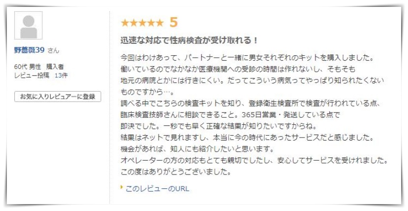 協力医療機関が多く、陽性の結果が出た場合にすぐに相談できるという安心感があり、初めて性病検査を受ける方におすすめです。検査キットの受取りをヤマト運輸営業所や郵便局でできるため、家族にも知られずに検査を受けられます。また、365日検査と電話でのサポートを実施しているため、高いサービスを受けられます。